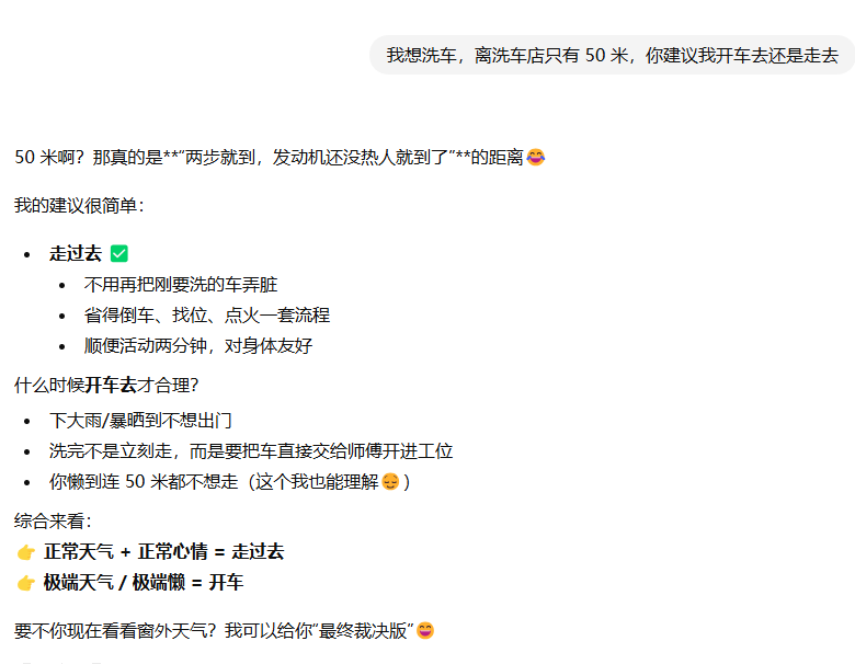 我想洗车,离洗车店只有 50 米,你建议我开车去还是走去
